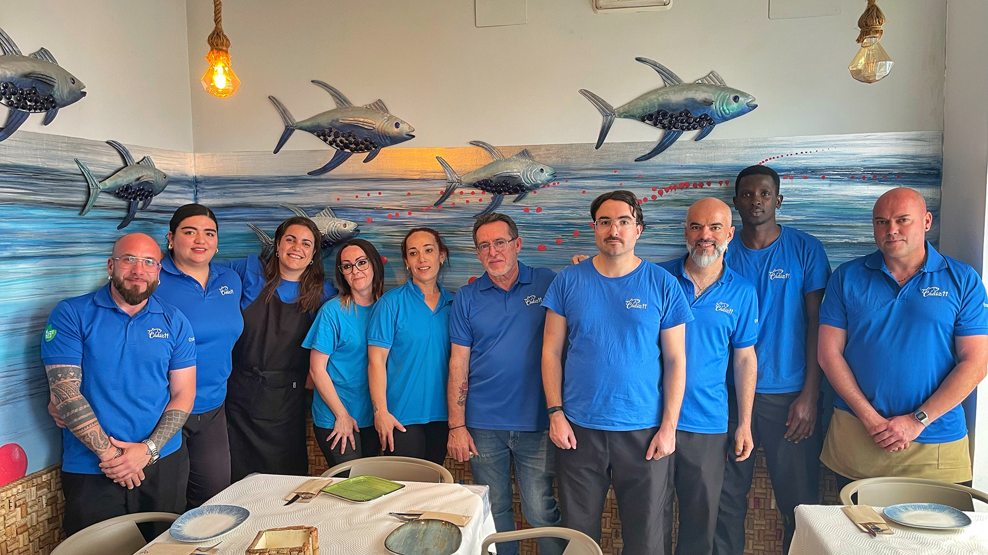 Dentro de esa amplia carta, en esta época, con las almadrabas en plena levantá, toma especial protagonismo el atún rojo procedente de los copos cercanos. Pero el túnido no se limita a la carta de Cádiz 11. Las paredes del local están decoradas por Sandra, una artista tristemente fallecida, que dejó la impronta de su obra en los dibujos del pescado y la trama de la almadraba para mostrar cómo funciona este milenario método de pesca sostenible que se remonta a la época de los fenicios.