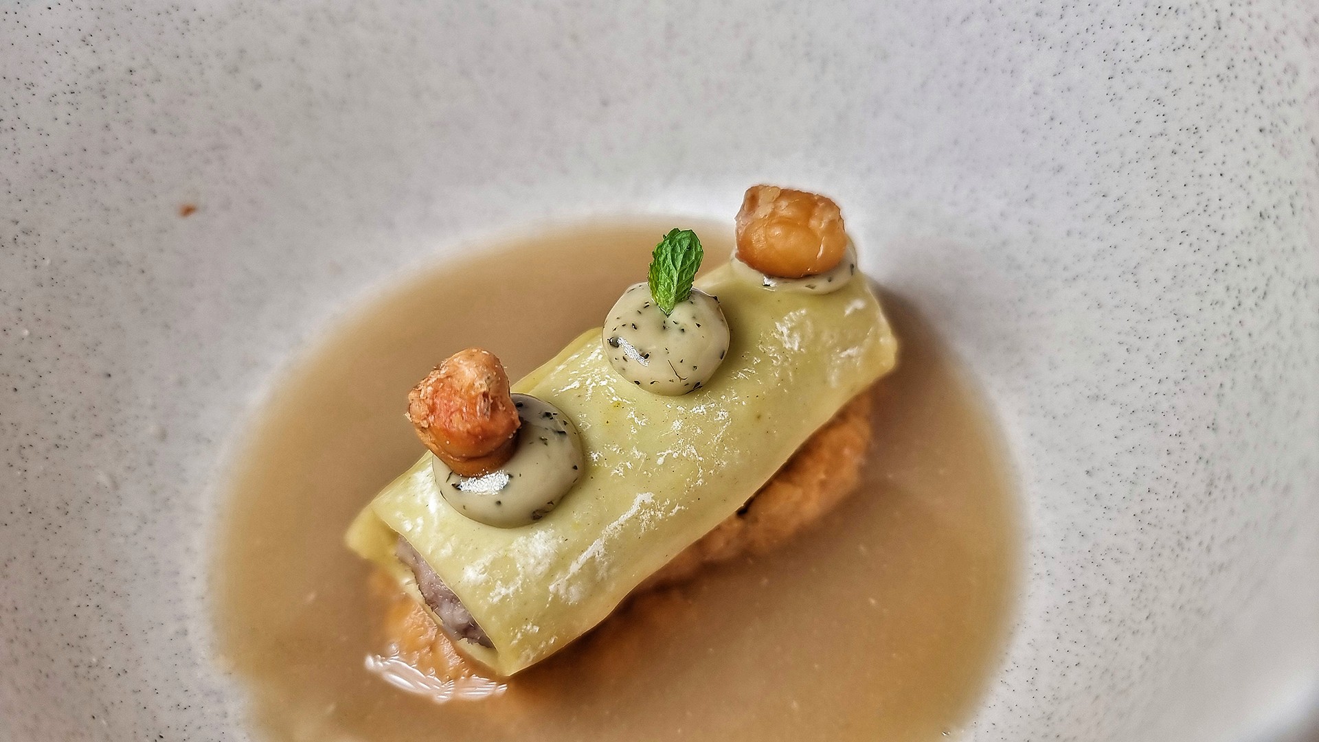 El puchero de la Inma es, seguramente, el plato del que más orgulloso se siente Álvaro. Para empezar, porque es de su madre, a la que homenajea con el nombre. Dice el gaditano que es, a partes iguales, un homenaje y una reivindicación: «Reivindicación porque hay un montón de cosas con pringá, croquetas de puchero… Pero, ¿dónde van esos garbanzos? ¿Dónde va ese puchero? ¿Las verduras? Hay hasta tacos de pringá… Pues nosotros hacemos este puchero clásico de homenaje a mi madre. En la base lleva un hummus con los garbanzos y las verduras del puchero, apio, zanahoria, puerro y nabo. Un canelón de wantun con la pringá, una mayonesa de hierbabuena, y los garbanzos crujientes».