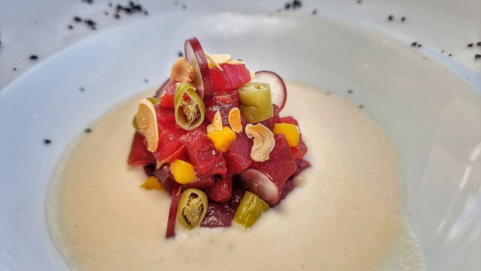 En estas Jornadas del Atún, los platos que Ramón Durán ha elegido comienzan con la ensaladilla según la receta de la abuela, con atún rojo macerado en soja, ralladura de limón y cebollino. El siguiente, un ajoblanco con atún rojo marinado, piparras, uva roja, mango y almendras.